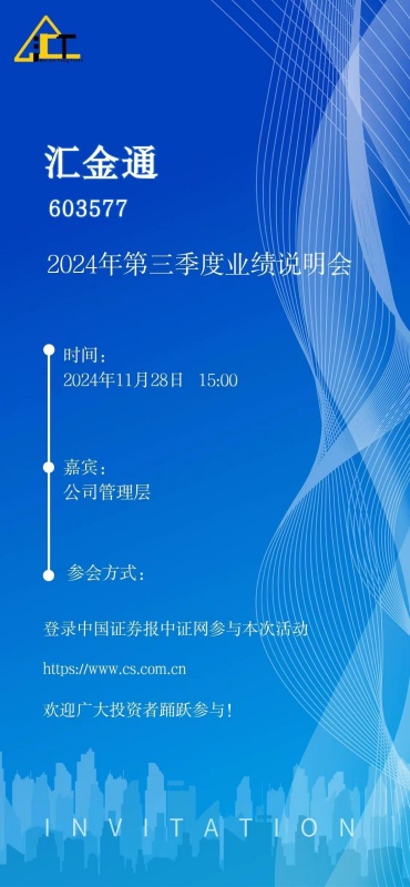 汇金通将于2024年10月28日15:00-17:00参加2024年青岛辖区上市公司投资者网上集体接待日活动暨汇金通2024年第三季度业绩说明会,