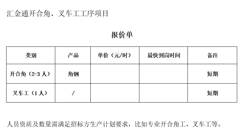 8、人员资质及数量需满足招标方生产计划要求,比如专业开合角工、叉车工等;