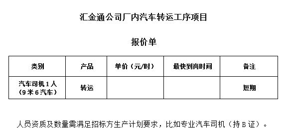 汇金通公司厂内汽车转运工序项目公开招标公告